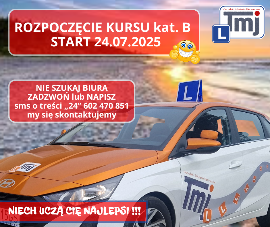 📣ZRÓB TEORIĘ w WAKACJE⛱ 📌14.08 rozpoczęcie kursu🚕kat.B 👨‍⚕️badania lekarskie załatwisz w środę o 17:30 w ośrodku TMJ ♦️Jak dołączyć do kursu ❓ 🗣️NAJPROSTSZA METODA🛑 📌DZWOŃ lub napisz sms o treści “14” 📞602 470 851 my się skontaktujemy. 📌zapisz się przez formularz 👉 https://tmj-osk.pl/kontakt/ 👈 🔹W cenie kursu: – TEORIA 📚 Wykłady stacjonarne🪑, on-line lub e-learning🌐- Ty wybierasz😀. – Wykłady z pierwszej pomocy prowadzi RATOWNIK MEDYCZNY💟 – 30 godzin jazd🚦 – 30 min. jazda po PLACU WORD- GRATIS🚧 – lekarz 👨‍⚕️przyjmuje w ośrodku TMJ w każdą środę 17:30 – krótki okres oczekiwania na jazdy🚗 – materiały dydaktyczne📖 – płatność na raty 0% – dostęp online 🌐do bazy pytań jak na egzaminie WORD ‼️Egzaminy wewnętrzne przeprowadza EGZAMINATOR‼️ 📍Tłumaczymy jak załatwić wszystkie formalności 📜(nr. PKK, badania lekarskie…)🩺. 📍Otrzymujesz od nas wszystkie niezbędne druki, wnioski żeby załatwić PKK📃
